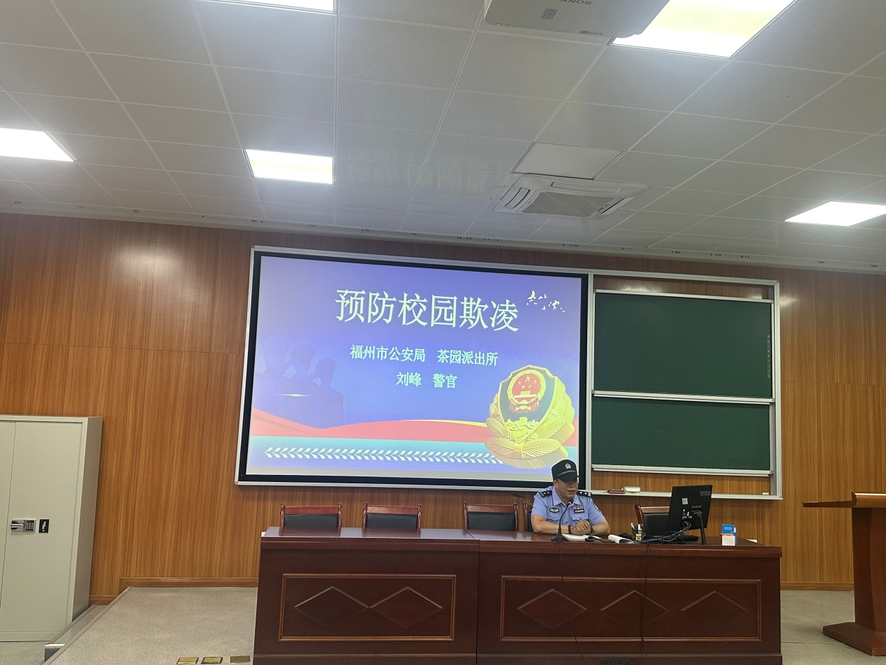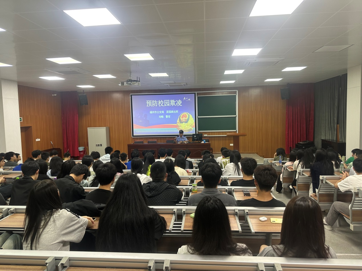 为了加强师生对校园欺凌的警觉性,增强学生的法制观念,有效预防和减少学生欺凌事件的发生,确保青少年身心健康和全面发展,5月10日下午,福州市公安局茶园派出所的刘峰警官受邀走进课堂,为我校23级学生举办了一场主题为“预防校园欺凌”的法治教育讲座。