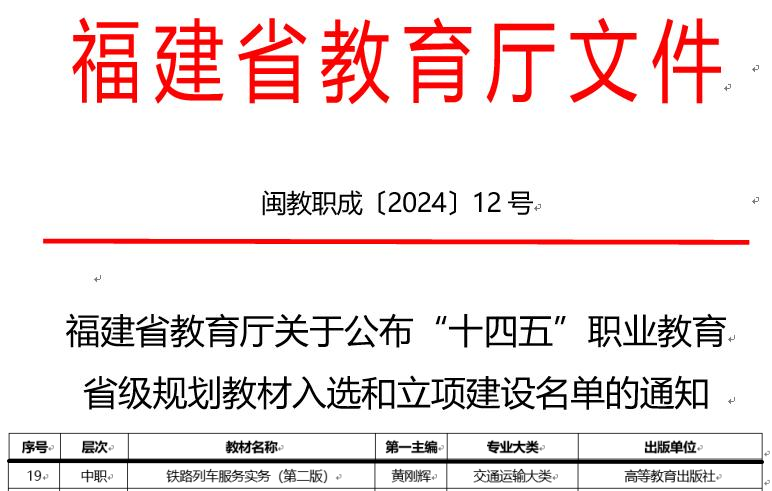 近日,我校传来喜讯,由我校交通工程系教师黄刚辉老师主编的《铁路列车服务实务(第二版)》成功入选“十四五”首批职业教育国家规划教材。