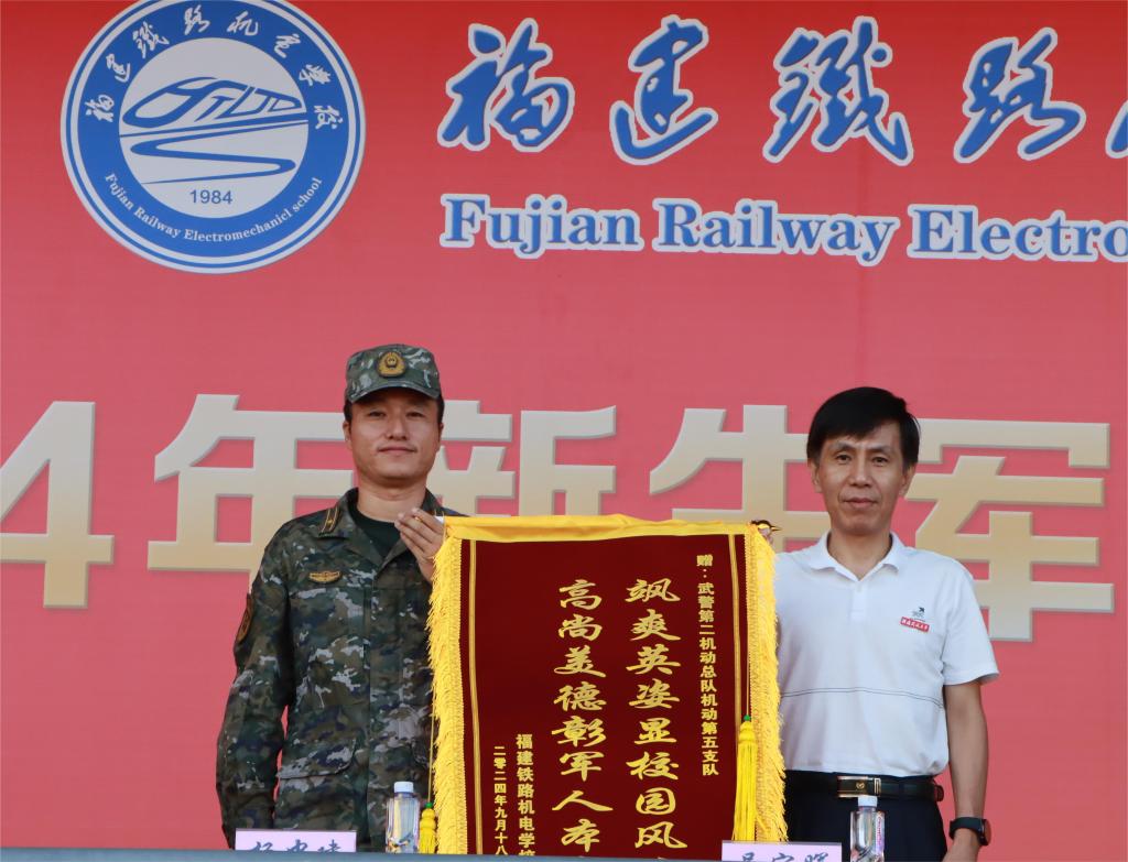 汇操结束后,对本次军训中的先进个人和先进集体进行了表彰。为感谢承训教官对本次军训的大力支持,吴宁晖代表学校向杨中建副大队长赠送锦旗。典礼的尾声,吴宁晖激励同学们能将在军训中培养的良好习惯融入到校园学习与生活中,努力拼博、奋发进取,以更加坚定的信念和昂扬的斗志去迎接未来的挑战,披荆斩棘,勇往直前,创造出更加辉煌的明天!