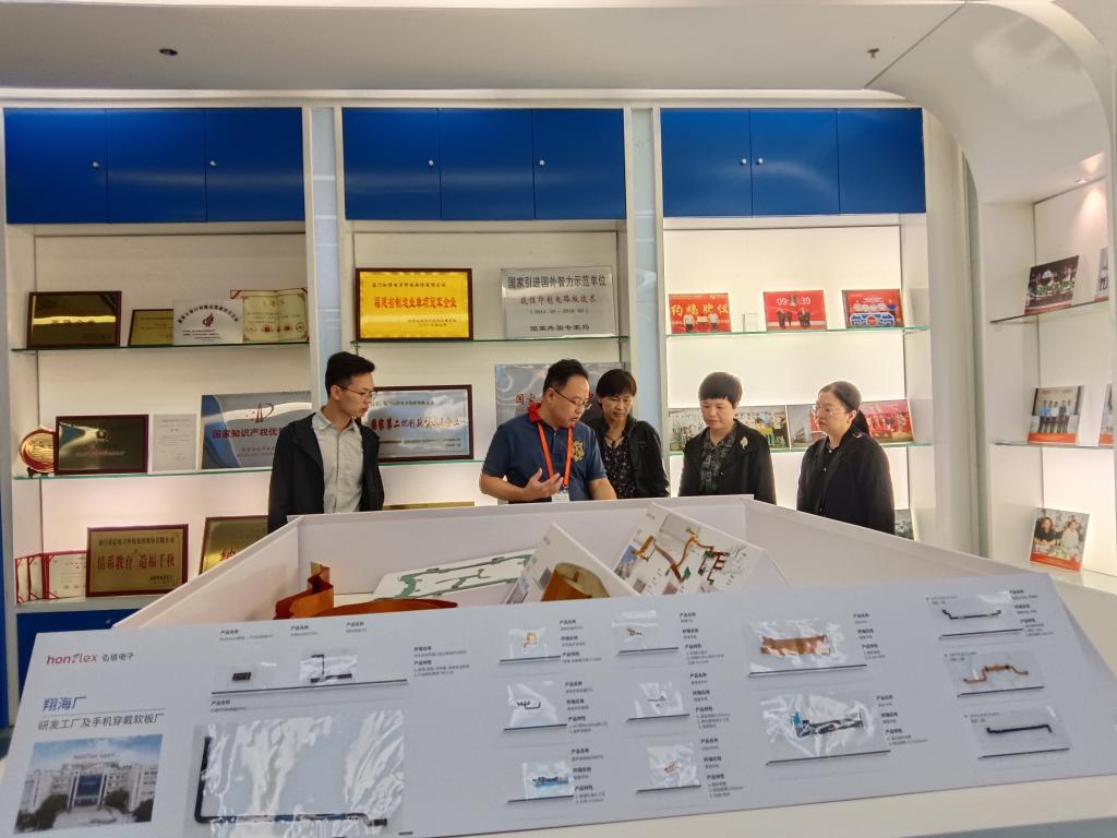 考察期间,我校团队受到了弘信电子科技集团的热情接待。集团负责人详细介绍了公司的发展历程、业务范围、企业文化以及产品特色。弘信电子作为国内柔性电子领域的领军企业,专注于柔性电路板、软硬结合板及背光模组等产品的研发与生产,其成就在电子制造领域成绩斐然。
