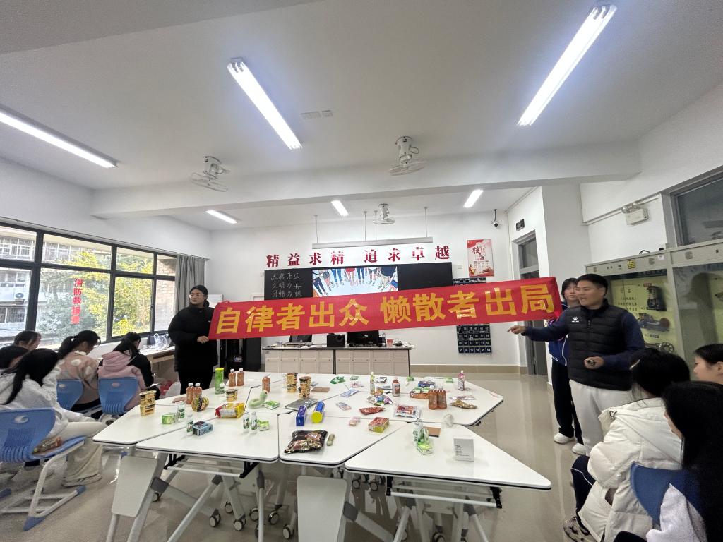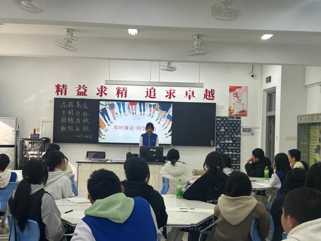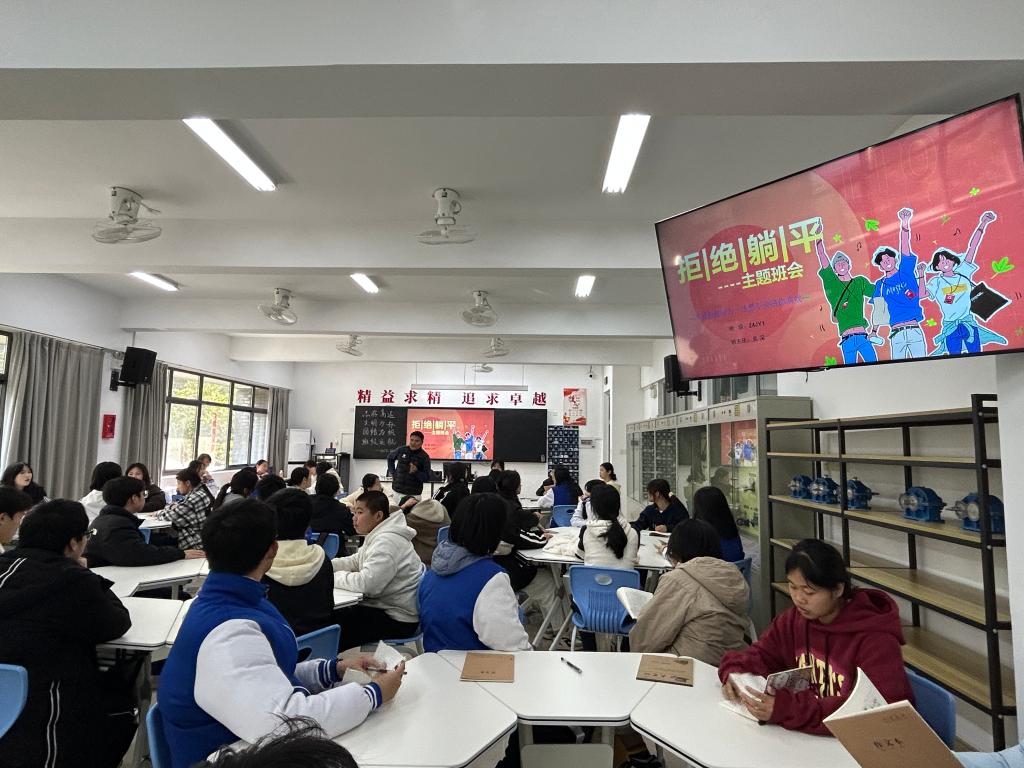 12月16日下午,24JY1班在博雅楼303教室成功举办了一场别开生面的主题班会公开课,本次活动由“悦心”班主任工作室精心策划,吸引了全校班主任老师到场观摩。此次班会以“拒绝躺平,不做45°青年”为主题,旨在点燃学生学习热情,提升复习效率,为期末考试做足准备。班会由班主任吴深老师主持,全班同学积极参与,现场气氛热烈。