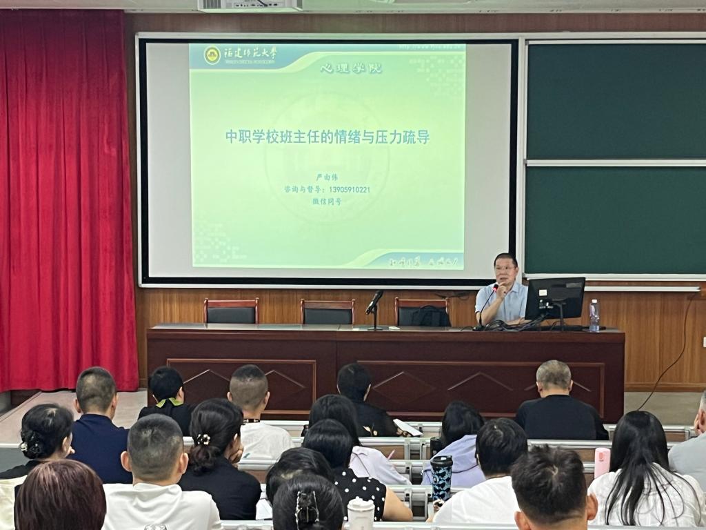 会议还邀请了福建师范大学严由伟教授做“中职学校班主任的情绪与压力疏导”主题讲座,他从中职班主任压力特点、职业困境出发,运用典型案例和理实结合,深入浅出地提出“频道切换”策略和“情绪自我疏导四步法”,用于有效纾解中职班主任的压力。