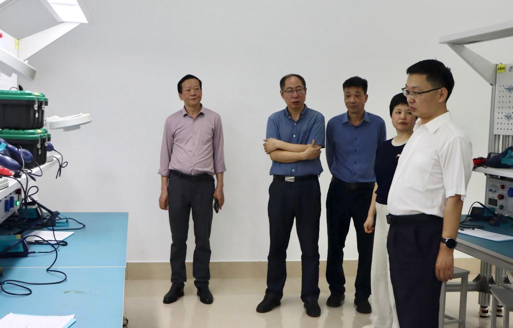 淡红升一行先深入我校机械基础多功能实训室、电工电子实验室、电工技能实训室、PLC实训室等场所,详细了解实践教学条件与设施设备情况。随后,在吴建铭校长的陪同下,来宾参观了“牢记嘱托 感恩奋进”专题馆。