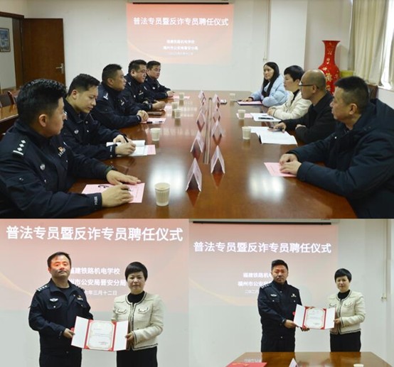 为深入推进法治校园、平安校园、无诈校园建设,进一步强化青少年法治教育与校园安全防范。3月12日下午,我校联合福州市公安局晋安分局举行校园普法专员、反诈专员聘任仪式。晋安分局副局长黄其安、政工室法制科民警,我校副校长汪媚、学生管理相关科室负责人共同参加仪式。