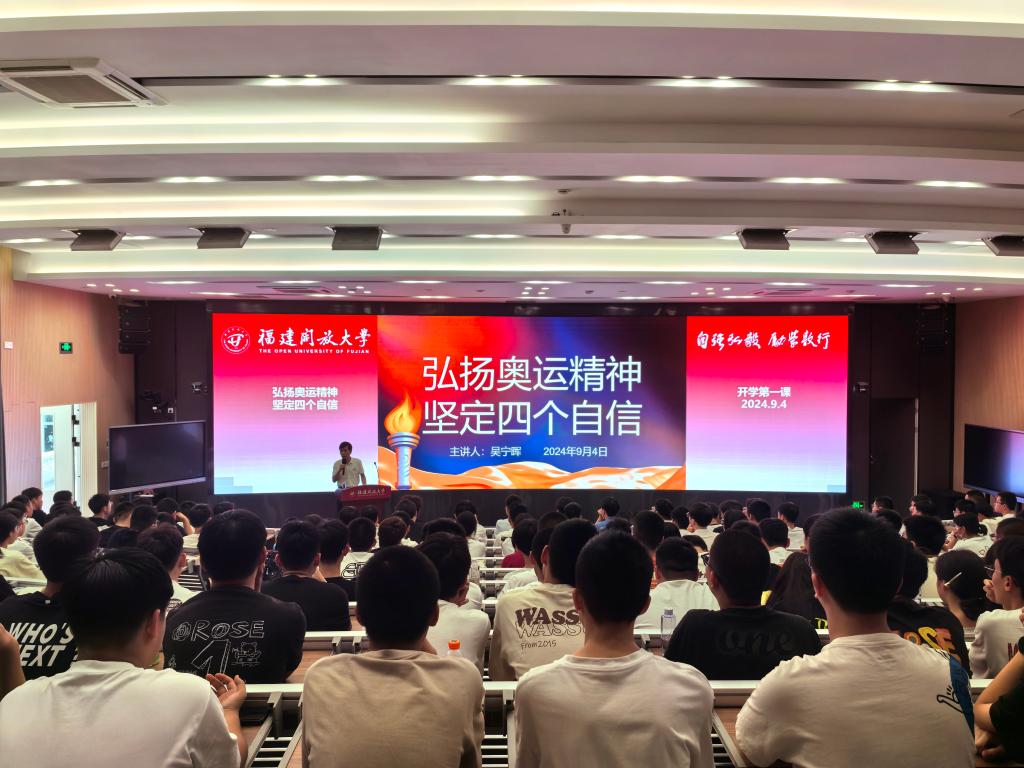 9 月 4 日下午,为进一步激发24级新生的爱国热情和奋斗精神,福建铁路机电学校党总支书记吴宁晖在智慧教室上了一堂以《弘扬奥运精神,坚定四个自信》为主题的专题党课。