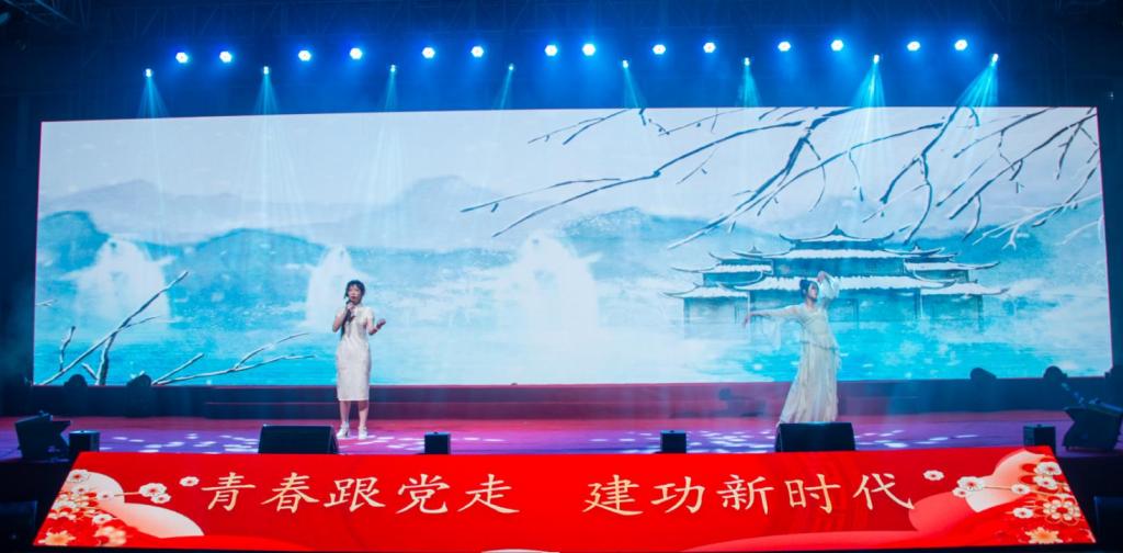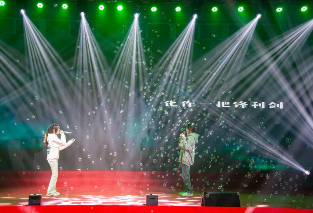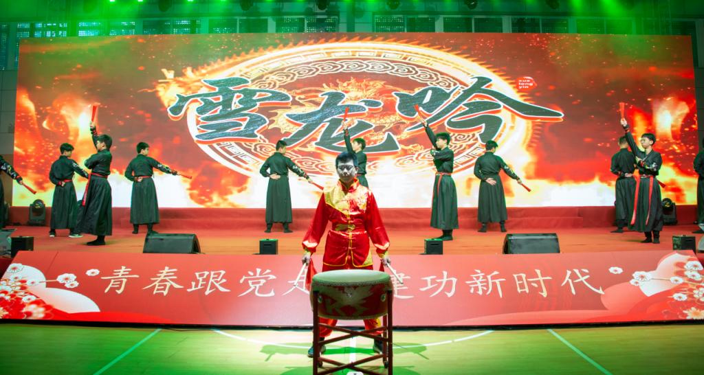 晚会在鼓乐齐鸣的开场舞《龙行龘龘》中拉开帷幕。晚会分为“忆往昔传承中国魂”、“看今朝青春正当时”、“向未来逐梦新时代”三个篇章,涵盖了舞蹈、合唱、情景剧、光影剧、乐队演奏、礼仪走秀等各具特色、形式多样的表演形式。在第一篇章中,李祺和黄展昕老师带来的歌曲《老男孩》,唱出了对青春的深深眷恋,现场掌声不断。《决爱·尽》悠扬的旋律,让人回味无穷;舞蹈《花腰傣》、歌伴舞《春庭雪》舞姿优美,展现了中国传统文化的魅力与底蕴;校主持人社朗诵节目《以青春的名义犒赏每一颗奋斗的中国心》致敬革命先辈,表达了新时代福铁学子热爱祖国的诚挚情感。
