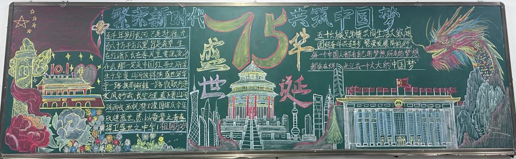为热烈庆祝新中国成立75周年,加强爱国主义教育,激发学生的创造力与团队协作能力,我校于9月中旬组织开展了以“繁荣新时代 共筑中国梦”为主题的黑板报评比活动。