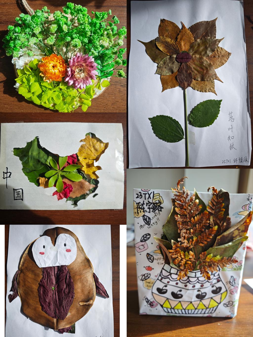 大赛自启动以来,得到了同学们的热烈响应。大家走出课堂、走进校园角落,弯腰捡拾形态各异、色彩斑斓的落叶——金黄的银杏叶、火红的枫叶、狭长的柳叶、圆润的梧桐叶,每一片落叶都承载着秋日的印记,成为同学们创作的天然素材。在创作过程中,同学们充分发挥想象力与创造力,或独自构思、或小组协作,经过筛选、修剪、拼接、粘贴等一系列步骤,将原本即将凋零的落叶赋予了新的生命与意义。
