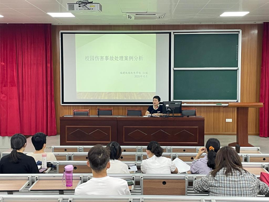 经验分享环节结束后,汪媚副校长围绕“校园伤害案例分析及班主任防患与处理策略”及学校近期刚出台的《福建铁路机电学校未成年人舆情应对处置办法》开展专题培训。她结合近年来国内发生的校园伤害典型案例,从案例背景、问题成因、处理过程及后续反思等方面进行深入剖析,让在场班主任深刻认识到校园安全管理的重要性与紧迫性。