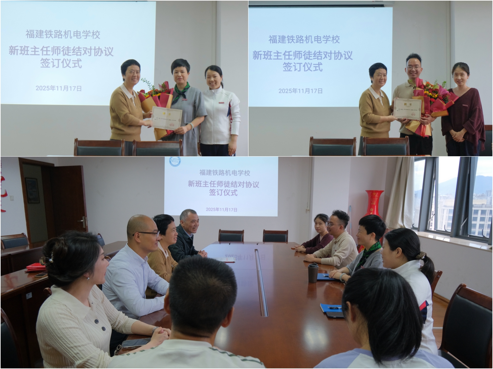 在全体与会人员的见证下,两对师徒郑重地签订了《班主任师徒结对协议》,并由工作室主持人黄玲玲向两位导师颁发了聘书。一纸协议,不仅是一份承诺,更是一份沉甸甸的责任。它架起了“青”与“蓝”之间经验与活力交融的桥梁,标志着我校班主任队伍“以老带新、以新促老”的共生共长模式进入了新的实践阶段。