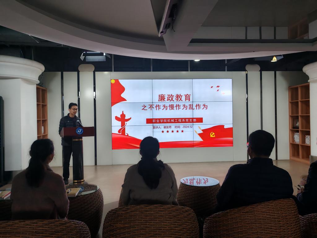 12月26日下午,机械工程系党支部于明德楼三楼廉政文化中心开展了以“廉政教育之不作为慢作为乱作为”为主题的专题党课。党课由支部书记谢友奇主讲,支部全体党员参与。